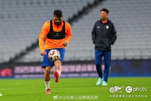 山东泰山在进行赛前踩场训练,积极备战明天与上海申花的中超联赛